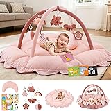 Mallify 5-in-1 Thick Plush Baby Play Gym Mat, Tummy Time Mat with 6 Sensory Toys, Baby Play Mat, Convertible Baby Gym for Stage-Based Development from Babies to Toddlers, Baby Essentials Gift, Pink