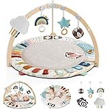 Blissful Diary Baby Play Gym & Activity Mat, 5 Developmental Zones Wooden Tummy Time Mat with 5 Detachable Sensory Toys for Motor Skills & Sensory Development, Baby Essentials Shower Gift